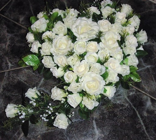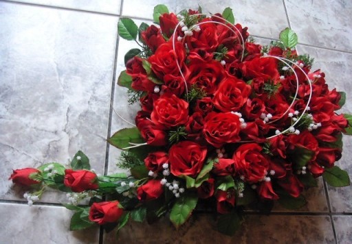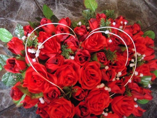 Oferujemy Państwu bardzo ciekawy, nietuzinkowy stroik w kształcie serca wykonany z róż w kolorze czerwonym. Do wykonania oferowanej kompozycji użyto wysokiej jakości ok. 60 sztuk kwiatów sztucznych róż, zielonych gałązek, gipsówki i innych dodatków florystycznych.Użyte materiały są bardzo dobrej jakości, odporne na warunki atmosferyczne. Serce wykonane jest na styropianie przyklejonym do wodoodpornej sklejki. Od spodu jest zamocowana podpórka która służy również za "rączkę" do trzymania serca. W kompozycji użyto róż w różnych fazach rozkwitu, kwiaty są ładnie ułożone, można je delikatnie formować wg własnego uznania, kompozycja z każdej strony prezentuje się bardzo ładnie (nie ma tzw. tyłu). Oferowana kompozycja jest bardzo solidnie i starannie wykonana z dbałością o każdy detal z dostępnych w danym momencie kwiatów i dodatków w naszej pracowni, dzięki swej oryginalności i subtelności przyciąga wzrok innych i będzie uroczą, trwałą ozdobą grobu bliskiej osoby ... wnętrza.