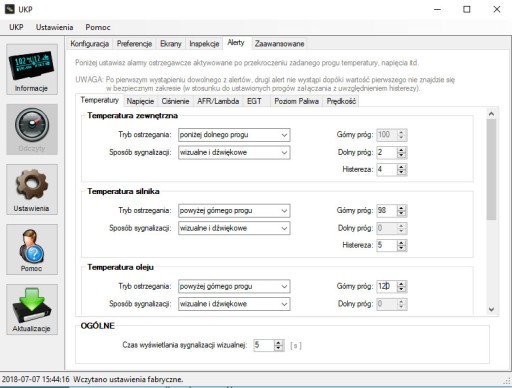 - na każde z powyższych wskazań ustawić własne alerty ostrzegawcze, np. zbyt wysoka temperatura oleju, zbyt wysokie ciśnienie doładowania, zbyt niskie ciśnienie oleju, AFR poza zakresem, zbyt wysoka temperatura spalin (EGT) itd.