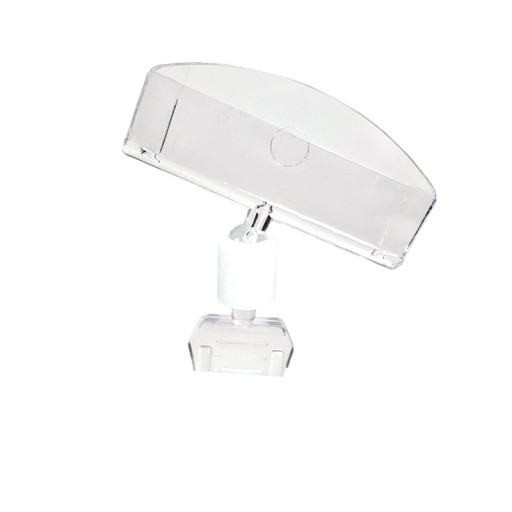 Bezbarwny uchwyt z żabką wykonany z przezroczystego tworzywa. Może posłużyć jako uchwyt do metek cenowych, informacji promocyjnych, oznaczeń produktów