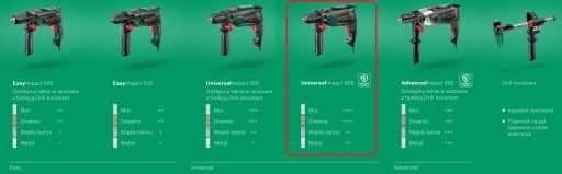 - Wysoka wydajność wiercenia zapewnia maksymalną wszechstronność. Dzięki wydajnemu silnikowi o mocy 800 W i nowemu mechanizmowi udarowemu zawsze masz pod ręką odpowiednie narzędzie do wykonania danego zadania – do wszystkich materiałów, także betonu