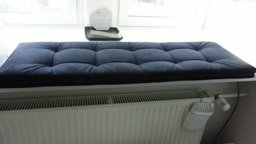 Przykład aranżacji wykonanej na ławce w kuchni z wykonaniem siedziska z tkaniny plusz 14 grey pikowanej bezbarwnymi koralikami. Opcje dodatkowe mocowanie w postaci troczków do wiązania na oparciach ławki, wzmocniona, twardsza pianka T 30