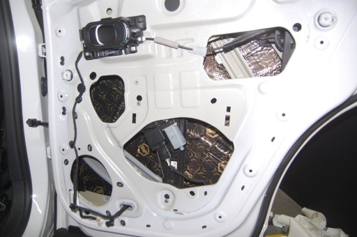 - Maty butylowe naklejamy na niedużą zakładkę. Omijamy miejsca montażowe na śruby, a wiązki elektryczne wyciągamy na zewnątrz.