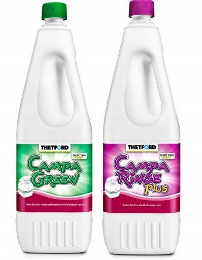 Ekonomiczny zestaw płynów do przenośnych toalet turystycznych. Płyn THETFORD CAMPA Green, biodegradowalny płyn do toalet turystycznych, przeznaczony do dolnego zbiornika na nieczystości, o działaniu antybakteryjnym i czyszczącym. Bardzo mocnym i wydajny. Przyspiesza rozkład fekaliów, dzięki czemu można łatwo opróżnić dolny zbiornik. Campa Rinse, biodegradowalny płyn przeznaczony do górnego zbiornika na wodę. Ulepszona formuła nabłyszcza i pozostawia ochronną powłokę na muszli. Ułatwia utrzymanie czystości w przenośnej toalecie turystycznej. Synergiczne działanie płynów, przyspiesza rozkład fekaliów, dzięki czemu można łatwo opróżnić dolny zbiornik. Zapobiega mnożeniu się bakterii, minimalizuje tworzenie się gazów. Aby zwiększyć skuteczność działania, zalecamy stosowanie specjalnego papieru toaletowego, który rozpuszcza się w rezerwuarze i nie tworzy zatorów.