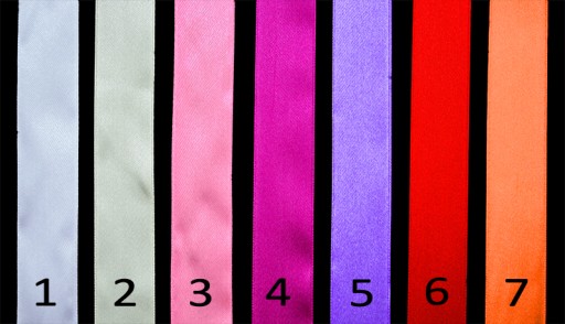 Dostępna kolorystyka wstążek: 1. biały, 2. ecru, 3. różowy, 4. fuksja, 5. fiolet, 6. czerwony, 7. pomarańczowy.