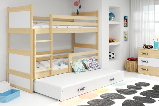 Do łóżka piętrowego 3 osobowego dołączamy pojemną szufladę, wykonaną z drewna i laminowanej płyty wiórowej. W szufladzie zmieścisz pościel i zabawki. Szuflada nie posiada prowadnic. Kolorowy pasek w szufladzie jest w formie NAKLEJKI do samodzielnego przyklejenia podczas montażu.