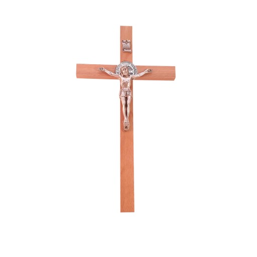 Duży krzyż Benedyktyński ścienny wykonany z drewna bukowego. Lakierowany. . Medalion Św. Benedykta o średnicy 3 cm.