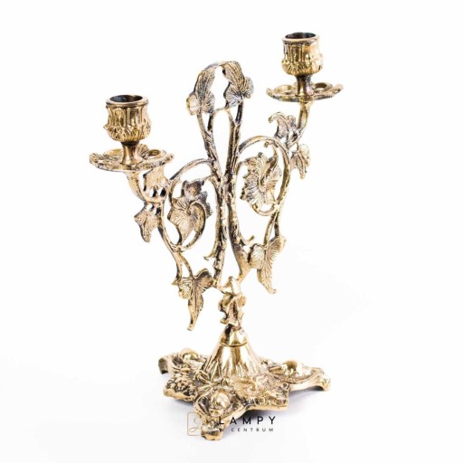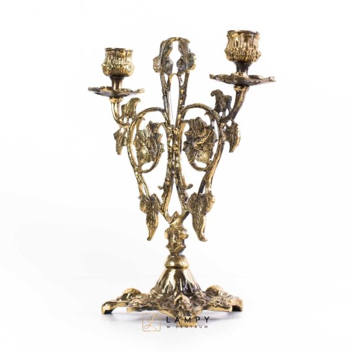 Świecznik na dwie świece utrzymany w antycznym charakterze, przepolerowany w miejscach eksponowanych, ciemniejszy w zakamarkach. Delikatnie zdobiona podstawa idealnie współgra z resztą świecznika. Oryginalne wzornictwo z motywem winorośli sprawia, że wspaniale prezentuje się we wnętrzach tradycyjnych oraz nowoczesnych. Mosiężny świecznik został pokryty lakierem zapobiegającym utlenianiu się mosiądzu.