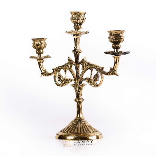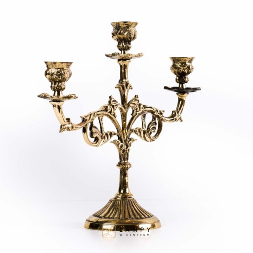 Świecznik na trzy świece utrzymany w antycznym charakterze, przepolerowany w miejscach eksponowanych, ciemniejszy w zakamarkach. Delikatnie zdobiona podstawa idealnie współgra z resztą świecznika. Oryginalne wzornictwo z motywem roślinnym sprawia, że wspaniale prezentuje się we wnętrzach tradycyjnych oraz nowoczesnych. Mosiężny świecznik został pokryty lakierem zapobiegającym utlenianiu się mosiądzu.