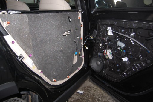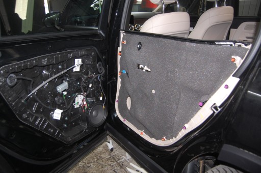 - Maty butylowe naklejamy na niedużą zakładkę. Omijamy miejsca montażowe na śruby, a wiązki elektryczne wyciągamy na zewnątrz.