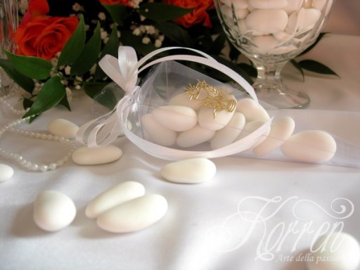 Eleganckie pudełeczko rożek z hostią wykonane z wysokiej jakości papieru, w środku 5 szt lukrowanych słodkości w sakiewce tiulowej wszystko ozdobione perfekcyjnie zawiązanymi kokardkami oraz dołączony bilecik z nadrukiem, wierszyk, imiona i data.