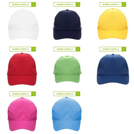 - Kolor czapki: 10 dostępnych kolorów widocznych niżej
