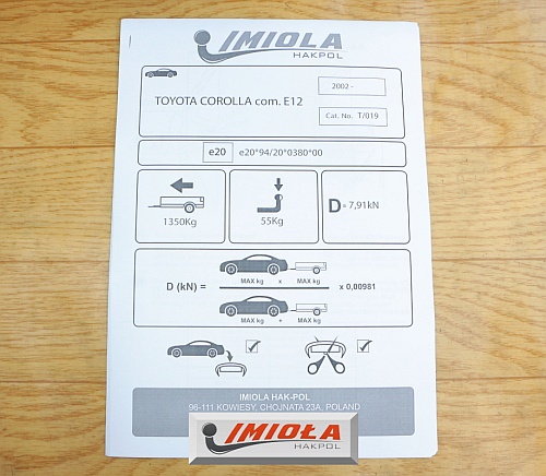 - Obowiązkowa Homologacja: Tak e20. Homologacja jest wymagana do zarejestrowania haka w Polsce i pozostałych krajach. Numer homologacji jest umieszczony na tabliczce znamionowej.