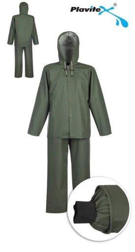 Ubranie złożone z kurtki z kapturem zapinanej na napy oraz spodni ogrodniczek z regulowanymi szelkami z elastyczną, szeroką gumą z tyłu. Model produkowany z wodoochronnej tkaniny Plavitex, przeznaczony do użytku w niesprzyjających warunkach pogodowych. Zapewnia skuteczną ochronę przed wiatrem i deszczem. Technika obustronnego zgrzewania zwiększa wytrzymałość szwów. Produkt spełnia standardy europejskich norm: EN ISO 13688 i EN 343.