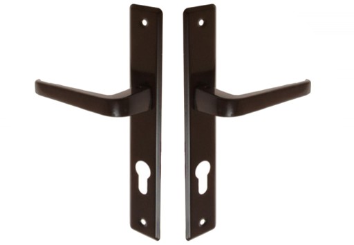 Komplet klamek w kolorze brązowym. Długi szyld z przebiciem na wkładkę.