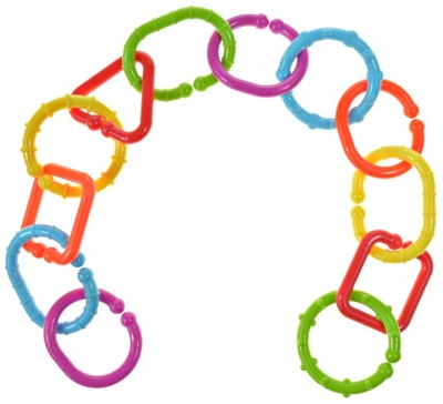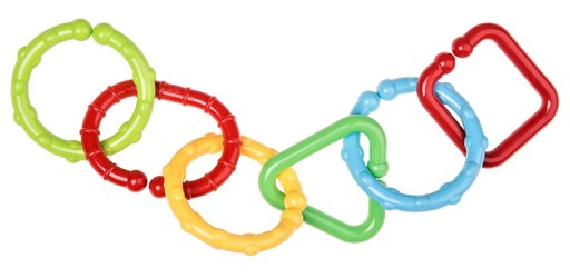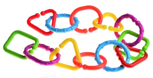 Kółka można łączyćnawzajem ze sobą tworząc długą linkę-łańcuszek. Mają ciekawe wypustki, wzory, różne struktury stymulującezmysł dotyku dziecka oraz zachęcające do zabawy.