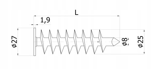 - Do mocowania lekkich elementów w warstwie styropianu lub wełny. Stosowany najczęściej do montażu kamer, lamp i numeracji budynków.