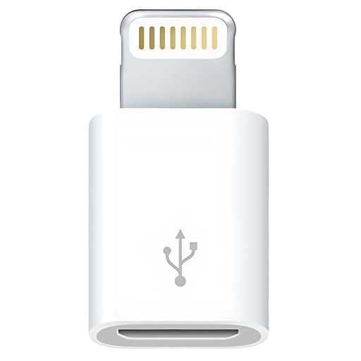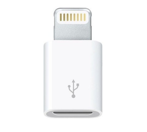 - Adapter z micro USB na Lightning, który służy jako przejściówka pozwalająca na połączenie urządzeń lub akcesoriów z złączem micro USB ze sprzętem Apple posiadającym złącze Lightning.