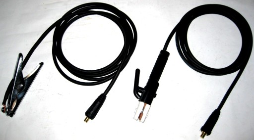 Na szczególną uwagę w naszych przewodach zasługuje, solidne połączenie przewodu z uchwytem elektrody (patrz foto). Na końcu przewodu, przy połączeniu z uchwytem, zaciskamy prasą hydrauliczną, grube solidne końcówki miedziane, co przy minimalnych kosztach (około 5-8 zł) zabezpiecza cały przewód przed spadkami napięcia w tym newralgicznym miejscu i gwarantuje jego skuteczne działanie.