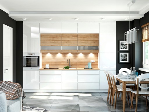 To, co wyróżnia tą kuchnię to pozioma linia uchwytów w szafkach stojących, szafki wiszące otwierają się bez zastosowania uchwytów typu tip - on, to wszystko sprawia, że cała zabudowa wygląda bardzo nowocześnie. Zestawiając taką formę frontów w kolorze białym z frontami w kolorze drewna jesteśmy w stanie optycznie powiększyć pomieszczenie kuchenne nadając mu harmonii, elegancji i nowoczesnego wyglądu.