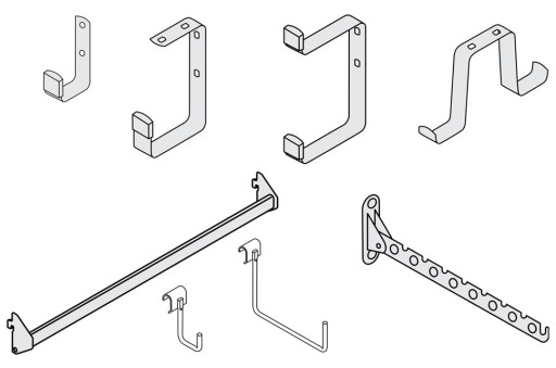- haki do drążka suportowego: 90 x 55 - 15kg; 140 x 190 - 4kg (drążek suportowy wpinany jest w listwy nośne)