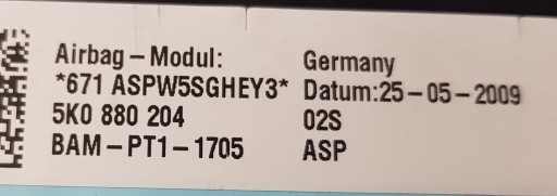 PODUSZKA PASAŻERA VW GOLF VI 5K0880204 ORYGINAŁ