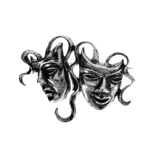 Srebrna broszka dla miłośników teatru i sztuki. Przedstawia maski teatralne. Wykonana została z najwyższej próby srebra 925, dającej gwarancję jakości. Dodatkowo została przyciemniona oksydą aby podkreślić jej kształty.