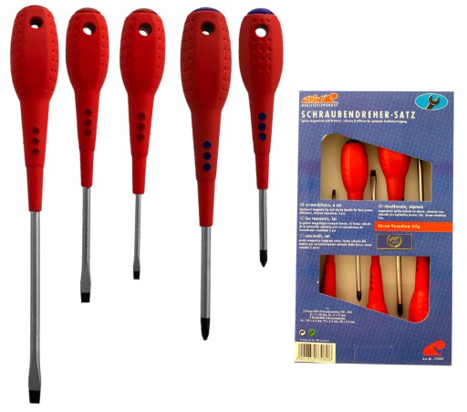 - Oferta dotyczy kompletu 5 sztuk śrubokręta, wkrętaka: śrubokręt krzyżakowy PH1 (1 sztuka), śrubokręt krzyżakowy PH2 (1 sztuka), śrubokręt płaski 120x6,5 mm (1 sztuka), śrubokręt płaski 75x5,5 mm (1 sztuka), śrubokręt płaski 50x3,5 mm (1 sztuka).