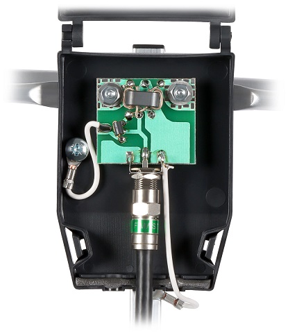 W antenie zastosowany został symetryzator na złącze F, który zapewnia dobre dopasowanie anteny oraz małe straty sygnału. Ponadto, montaż przewodu antenowego jest bardzo prosty i wygodny. Dodatkowym atutem jest możliwość zastosowania złączy kompresyjnych, które zapewniają najtrwalsze połączenie (w zestawie znajduje się złącze nakręcane).