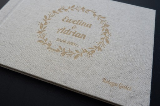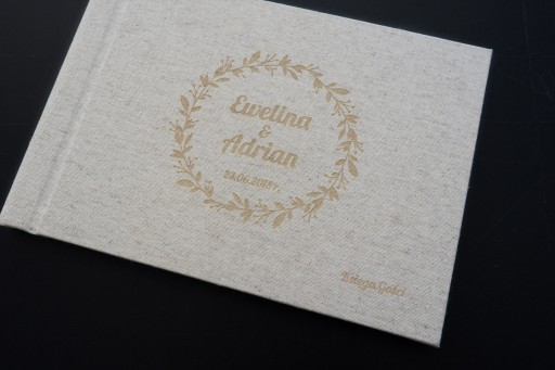 Księga obita jest tkaniną introligatorską z naturalnego Lnu. Grawerunek wyjdzie w kolorze takim na na zdjęciach.