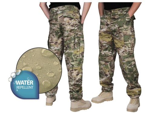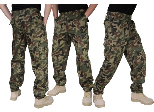 - posiadają 6 kieszeni, 2 z przodu, 2 z tyłu, 2 kieszenie transportowe na udach typ CARGO. Spodnie oraz kieszenie zapinane są na guziki