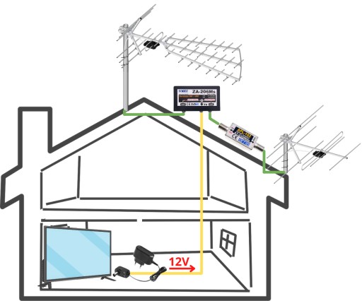 Schemat zastosowania wzmacniacza do anteny Dipol 7 na pasmo VHF (mux-8) połączonej z anteną Dipol Tri Digit na pasmo UHF za pomocą zwrotnicy.