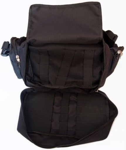 Torba posiada 4 kieszenie.Pierwsza z nich przeznaczona jest do przewozu butelek - kieszeni jest modyfikowana w zależności od wielkości butelki - może mieć trzy różne rozmiary. Wejdzie w nią spokojnie 1,5 l butelka. Druga mała kieszeń przeznaczona na różnego rodzaju drobiazgi. Trzecia największa kieszeń podzielona jest jeszcze na małą kieszeń zewnętrzną która świetnie się sprawdza w wożeniu telefonu, dokumentów pieniędzy, można się do niej szybko dostać.Większa kieszeń ma dwie przegrody oddzielone materiałem. Każda w przegród posiada wszytych kilkanaście gumowanych taśm ułatwiających przewożenie narzędzi. Torba posiada podwójny szeroki pas jako pierwszy zapinany jest szeroki pas który po pierwsze daje podwójne bezpieczeństwo zapięcia po drugie zwiększa komfort użytkowania gdyż drugi cieńszy w pełni regulowany pas nie przylega bezpośrednio do ciała. Klapa zewnętrzna zapinana jest na dwa rzepy pod klapa + dwa zewnętrzne paski spinające cała narzędziówkę.