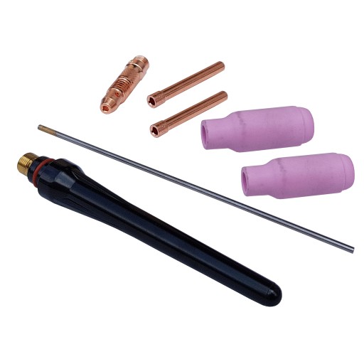 Uchwyt spawalniczy TIG z przyłączem ŁW 35-50. Jest kompletnie uzbrojony i gotowy do pracy.