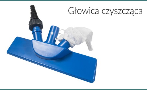 - głowica czyszcząca z workiem na zanieczyszczenia wielokrotnego użytku, tzw. odkurzacz basenowy, który po podłączeniu do węża ogrodowego wypłukuje zanieczyszczenia z dna basenu do woreczka zamocowanego na końcu,
