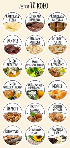Zestaw 10: Czekolada biała, Czekolada deserowa, Czekolada mleczna, Daktyle, Migdały mielone, Migdały płatki, Miód akacjowy, Miód gryczano-lipowy, Miód rzepakowy, Miód wielokwiatowy, Miód z kwiatu pomarańczy, Morele, Orzechy, Orzechy laskowe, Orzechy włoskie, Rodzynki, Słonecznik pestki, Wanilia laski.