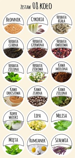 Zestaw 08: Błonnik, Cykoria, Herbata biała, Herbata czarna, Herbata czerwona, Herbata owocowa, Herbata zielona, Herbata ziołowa, Kawa mielona, Kawa orkiszowa, Kawa ziarna, Kawa zielona, Koper włoski, Lipa, Melisa, Mięta, Rumianek, Szałwia.
