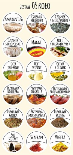 Zestaw 05: Amarantus, Czosnek kolorowy, Czosnek niedźwiedzi, Czosnek staropolski, Maggi, Ocet balsamiczny, Ocet jabłkowy, Ocet winny, Oliwa z oliwek, Przyprawa do chleba, Przyprawa do grilla, Przyprawa do mięsa wołowego, Przyprawa grecka, Przyprawa meksykańska, Przyprawa włoska, Sos sojowy, Szafran, Vegeta.