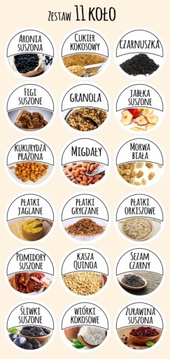 Zestaw 11: Aronia suszona, Cukier kokosowy, Czarnuszka, Figi suszone, Granola, Jabłka suszone, Kukurydza prażona, Migdały, Morwa biała, Płatki jaglane, Płatki gryczane, Płatki orkiszowe, Pomidory suszone, Kasza Quinoa, Sezam czarny, Śliwki suszone, Wiórki kokosowe, Żurawina suszona.