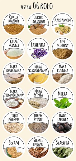 Zestaw 06: Cukier brązowy, Cukier trzcinowy, Kardamon, Kasza manna, Lawenda, Len mielony, Mąka krupczatka, Mąka kukurydziana, Mąka pszenna, Mąka ziemniaczana, Mąka żytnia, Mięta, Otręby pszenne, Otręby żytnie, Owoc jałowca, Sezam, Siemię lniane, Szałwia.