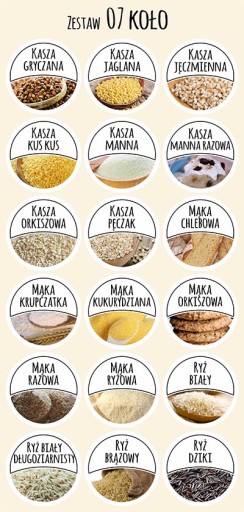 Zestaw 07: Kasza gryczana, Kasza jaglana, Kasza jęczmienna, Kasza kus kus, Kasza manna, Kasza manna razowa, Kasza orkiszowa, Kasza pęczak, Mąka chlebowa, Mąka krupczatka, Mąka kukurydziana, Mąka orkiszowa, Mąka razowa, Mąka ryżowa, Ryż biały, Ryż biały długoziarnisty, Ryż brązowy, Ryż dziki.