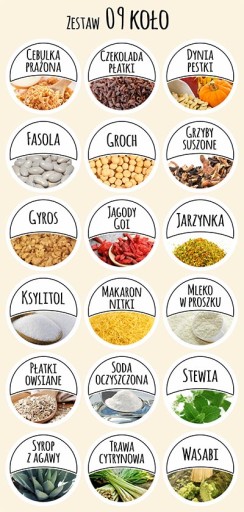Zestaw 09: Cebulka prażona, Czekolada płatki, Dynia pestki, Fasola, Groch, Grzyby suszone, Gyros, Jagody Goi, Jarzynka, Ksylitol, Makaron nitki, Mleko w proszku, Płatki owsiane, Soda oczyszczona, Stewia, Syrop z agawy, Trawa cytrynowa, Wasabi.