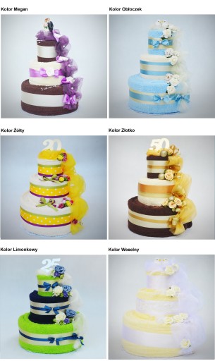 Każdy tort możemy wykonać w dowolnej kolorystyce ręczników - paleta kolorów dostępna poniżej. Na górę tortu możemy dodać jeden dowolny dodatek.