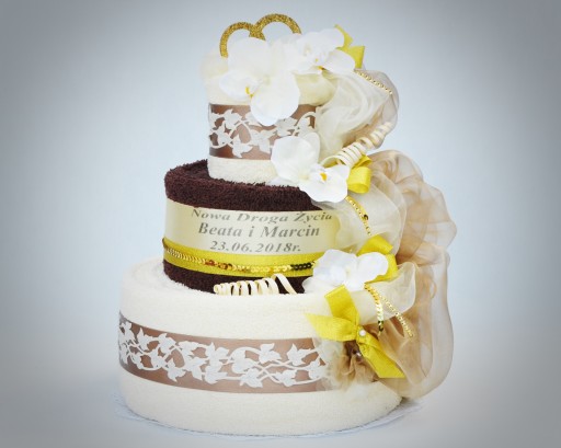 Zapraszamy do zakupu oryginalnego i eleganckiego prezentu jakim jest tort z ręczników. To doskonały prezent na ślub, rocznicę ślubu, urodziny, podziękowania dla rodziców. Doskonały, jako dodatek do "koperty" i prezent zamiast kwiatów. Tort z ręczników jest tak piękny jak bukiet, ale będzie cieszył oko dłużej. To bardzo ładny i równocześnie praktyczny prezent. Po jego rozwinięciu obdarowani będą się cieszyć miękkimi, grubymi i chłonnymi ręcznikami.