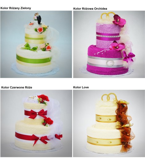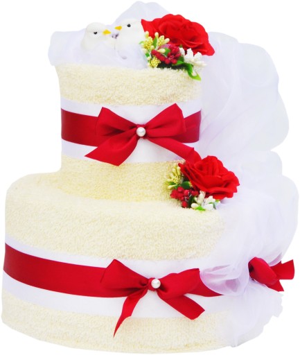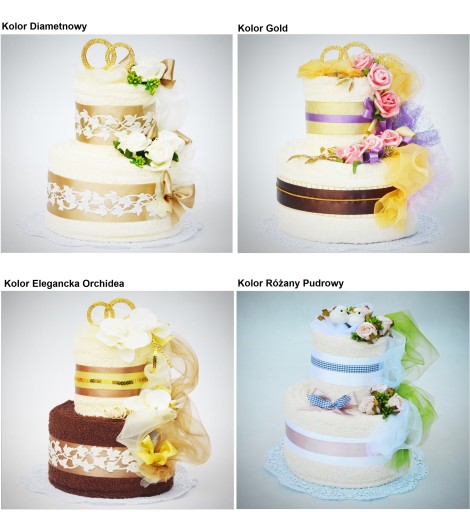Piękny i oryginalny prezent na ślub i rocznicę ślubu - praktyczny i elegancki komplet 2 DUŻYCH ręczników kąpielowych w kształcie tortu z bogatą dekoracją kwiatową.