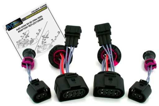 OPIS: Nowe okablowanie (przejściówka/adapter) do podłączenia do Audi A4/S4 B5 8D (1994-1999, przedlift) reflektorów soczewkowych ze zintegrowanym kierunkowskazem z Audi A4/S4/RS4 B5 8D (1999-2001, polift). W przypadku wymiany reflektorów w przedliftowym Audi A4/S4, które mają okrągłą wtyczkę, na reflektory z A4/S4/RS4 poliftowego, które mają płaską wtyczkę, niezbędne będzie zastosowanie przejściówek w celu ich podłączenia i prawidłowego funkcjonowania. Bardzo prosty montaż adapterów, wystarczy jeden koniec wpiąć w instalację auta, a drugi do reflektora i wszystko działa. Adaptery pasują bez żadnego problemu w oryginalne wtyczki auta i reflektorów.
