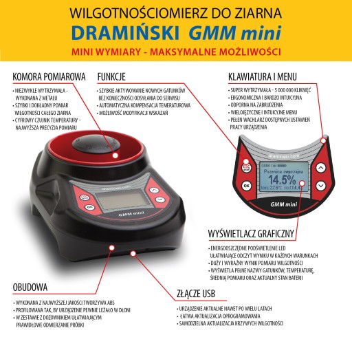 Dramiński GMM mini to najpopularniejszy model naszej produkcji. Jest małym, poręcznym i nowoczesnym a przez to niezbędnym narzędziem pracy w każdym gospodarstwie rolnym. Dzięki niemu bardzo szybko i dokładnie sprawdzisz wilgotność ziarna bezpośrednio na polu lub w miejscu gdzie przechowywane jest zboże. Dzięki wbudowanemu złączu USB aktualizacja danych kalibracyjnych oraz oprogramowania jest szybka a co najważniejsze łatwa do wykonania. Teraz bez odsyłania miernika do serwisu będziesz mógł cieszyć się jego najbardziej aktualną wersją nawet po wielu latach.