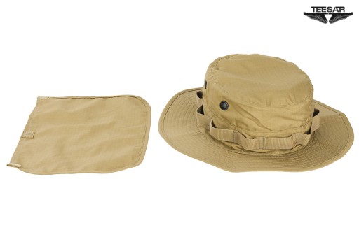 Uszyty z bardzo wytrzymałego materiału Rip-Stop - . Rip-Stop to specjalna technologia wzmacniania materiału poprzez dodanie w splot materiału włókien nylonu - charakterystyczna kratka. Materiał gruby i trwały a jednocześnie przewiewny, szybkoschnący i oddychający. Wyposażony w odpinany nakarczek chroniący szyję przed słońcem. Wywietrzniki z gęstą kratką która zapobiega wdarciu się insektów pod kapelusz. Szerokie i usztywniane rondo chroni przed słońcem oraz deszczem, dodatkowo przeszywane. Kapelusz w okół obszyty nylonową taśmą do mocowania maskowania lub moskitiery. Regulowany sznurek pod brodę z grubym skórzanym stoperem.