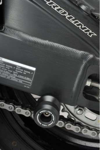 Przeznaczone są do mocowania w fabrycznych otworach w tylnym wahaczu, ich montaż przebiega błyskawicznie. Spełniają dwie funkcje: Minimalizują uszkodzenia wahacza i służą jako jako adaptery do podnoszenia motocykla za pomocą podnośnika. Efektowny design sprawia, że rekomendujemy je jako elementy tuningowe, wykonane z tworzywa.