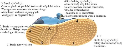 3. Strefa dysfunkcji. Oznacza płaskostopie lub/i koślawość stóp lub/i kolan. Wymaga stosowania obuwia zdrowotnego - dodatkowo wkładek supinujących