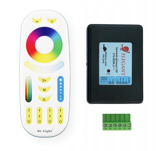 Sterownik cyfrowy muzyczny S70-800M 5-12V DC przeznaczony do taśm LED RGB Magic z układem scalonym WS2811 lub WS2812 wraz z pilotem 4-strefowym MiLight RGBWW FUT092 2,4 GHz RGB+CCT.